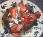 Gingerbread pancakes with maple syrup, blueberries, strawberries, hazelnuts, and powdered sugar.